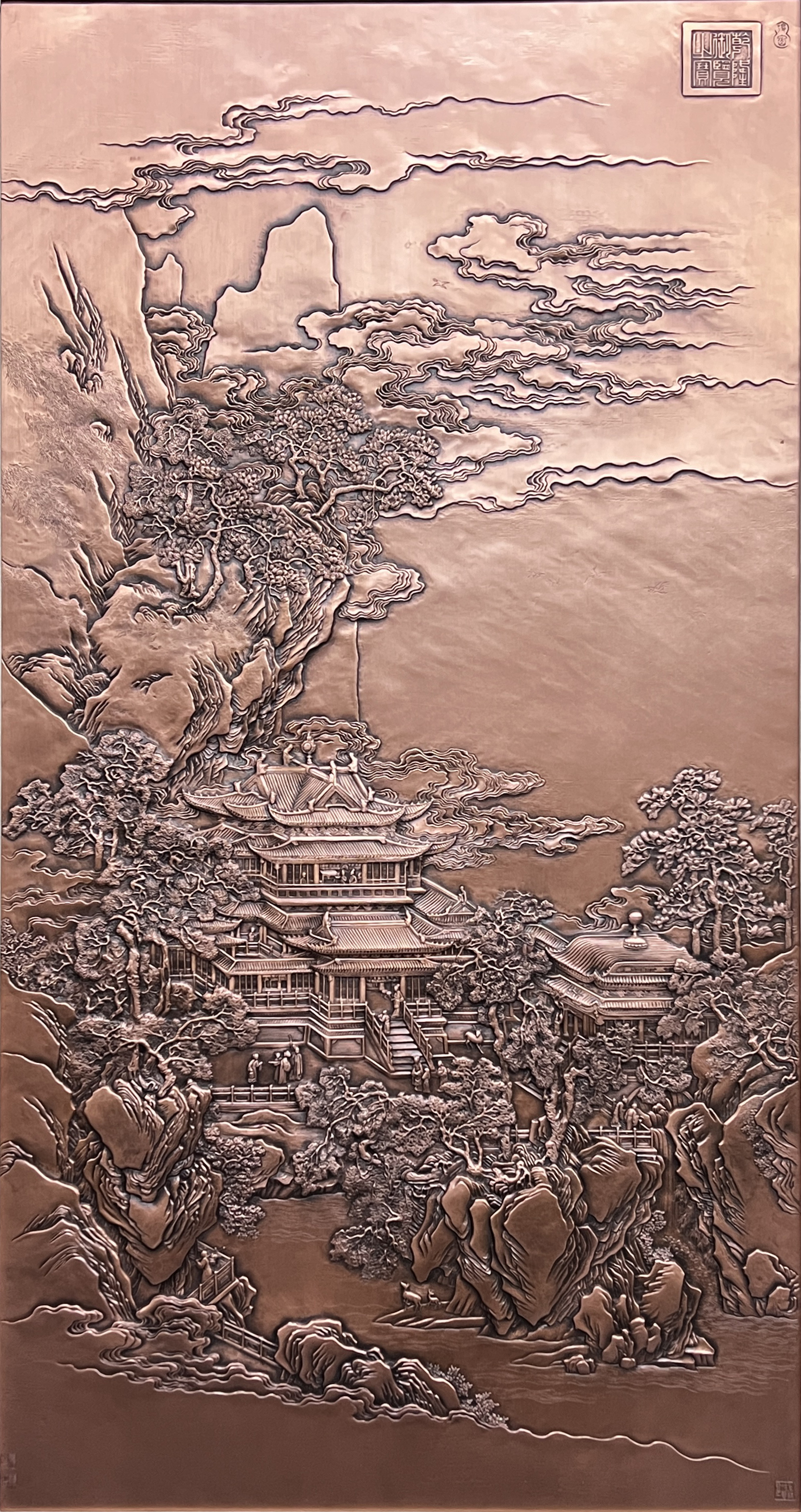 此紫銅壁畫采用非遺工藝——金屬鍛鏨——手工制作而成,做工極為精細,將人物神態、樓宇窗欞等細節一一呈現,工藝精湛,形神俱備,堪稱精品。