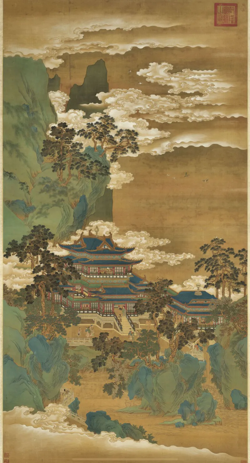 本作品取材自《仙山樓閣圖》,相傳為北宋趙伯駒所作,畫面瑰麗,想象雄奇,極富浪漫主義色彩。趙伯駒是南宋時期青綠山水畫的杰出代表之一,他的作品場面宏大,氣勢壯闊,在青綠山水畫的發展史上舉足輕重,對后世的山水畫家產生了深遠的影響,仇英、王希孟等一批著名畫家都受到了他的畫風的影響。