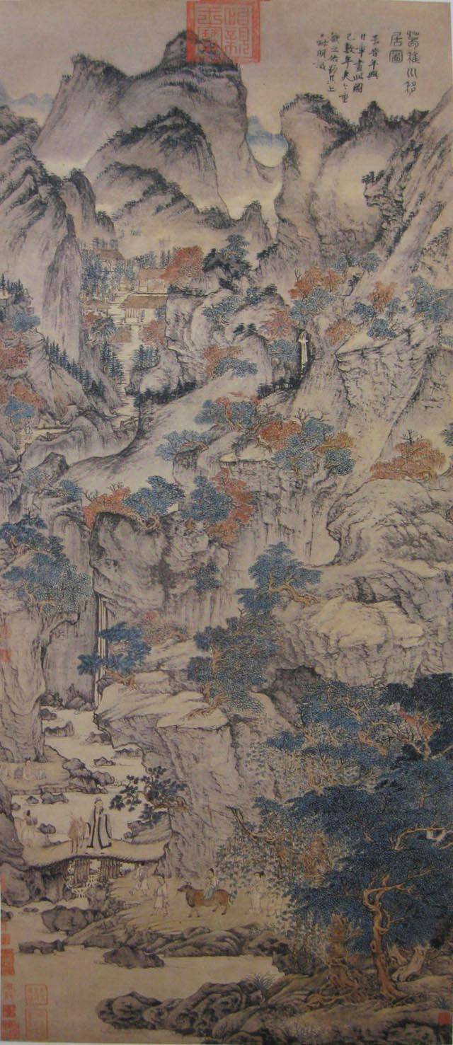 《葛稚川移居圖》是元代王蒙畫作,描繪葛洪舉家移居羅浮山、遁世修道的情景。葛洪字稚川,自號抱樸子,是東晉道教理論家、煉丹家、醫藥學家。畫中葛洪寬衣大袖,仙風道骨,一手執扇,一手牽鹿,正于橋上,回首看向家中女眷。一老嫗環抱小兒,端坐牛背,由家仆牽引前行,身后幾名年輕女眷,徒步緊隨。葛洪身前,一眾仆從身背經卷、葫蘆、家什等物,或于溪邊歇腳,或正兀自前行……此壁畫采用鍛鏨工藝,手工制成,耗時兩個月。壁畫中山石犖確、溪流淙淙、樹木叢生、藤蔓纏繞,山坳間又有茅舍房屋、煙嵐浮動等細節,仆從或腿腳輕便,或老成持重,匠人均不吝筆墨,一一再現,實為一件精雕細琢的紫銅鍛鏨佳品。